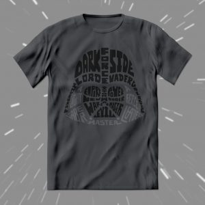 Playera de algodón en color gris carbón, estampada con la imagen de Darth Vader, formada por palabras relacionadas con el personaje.