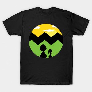 Playera de algodón en color negro, estampada con la imagen de las siluetas de Charlie Brown y Snoppy, sentados juntos mientras contemplan el horizonte.
