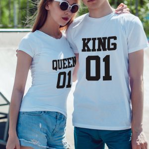 Paquete de 2 playeras de algodón de color blanco, para dama y caballero, estampadas con las palabras KING (REY) y QUEEN (REINA) y el número 01.