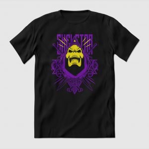 Playera de algodón en color negro, estampada con la imagen de y el nombre de SKELETOR, el villano de la caricatura de los 80’s: HE-MAN