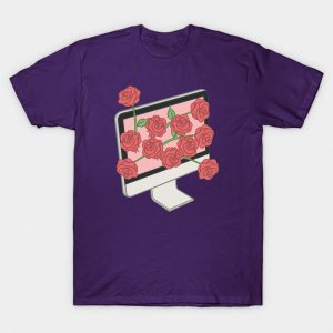 Playera de algodón en color morado, estampada con la imagen de una computadora Mac, de la que salen rosas rojas