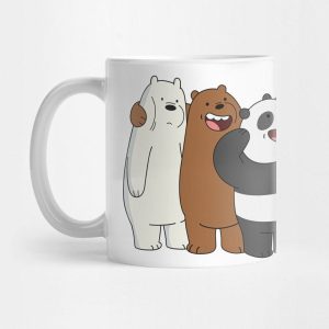 Taza de porcelana en color blanco, estampada con la imagen de los personajes de la caricatura Escandalosos (We Bare Bears): Pardo, Panda y Polar.