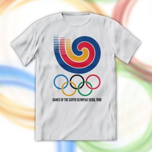 Playera de algodón en color blanco, estampada con el logo de los Juegos Olímpicos de Seúl 1988