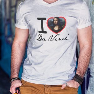 Playera para hombre de algodón en color blanco, estampada con la frase I ❤ Da Vinci, con un fragmento de su obra «La Gioconda» o «Monalisa»