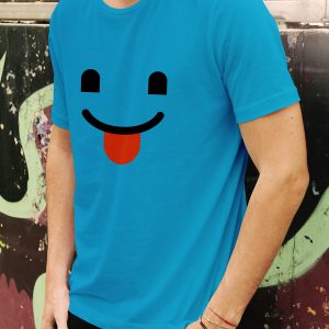 Playera de algodón para hombre en color azul, estampada con el emoji de sonrisa mostrando la lengua 😛