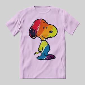 Playera de algodón en varios colores, estampada con la imagen de Snoopy con arcoíris.