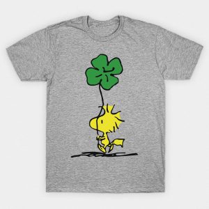 Playera de algodón en color gris, estampada con la imagen del pajarito Woodstock, llevando un trébol de cuatro hojas.