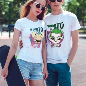 Paquete de 2 playeras de algodón de color blanco, para dama y caballero, estampadas con unos lindos Joker y Harley Quinn, y la leyenda Mi locura eres tú.