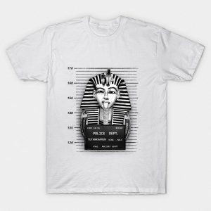 Playera de algodón en color negro, estampada con la imagen del rostro de Tutankamón, haciendo una mueca divertida, en una fotografía policial.