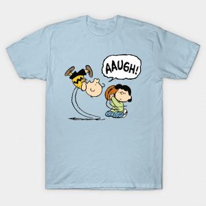 Playera de algodón en color azul claro, estampada con la imagen de Lucy, quitándole a Charlie Brown el balón de football cuando patea.