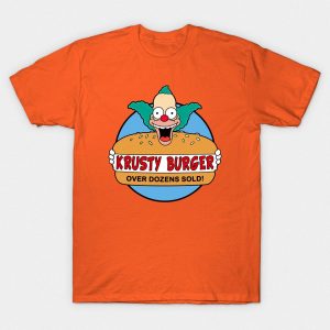 Playera de algodón en color naranja, estampada con la imagen de la cadena de comida rápida de Springfield, Krusty Burger.