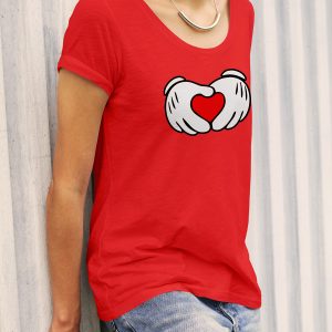 Playera de algodón para mujer en color rojo, estampada con las manos de Minnie Mouse, formando un corazón.
