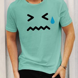 Playera de algodón para hombre en color aqua, estampada con el emoji de cara triste pero aliviado 😥