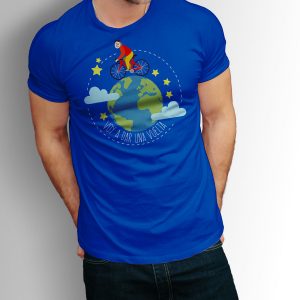 Playera de algodón para hombre en color azul, estampada con la imagen de in alegre ciclista dando la vuelta al mundo y la leyenda «Voy a dar una vuelta»