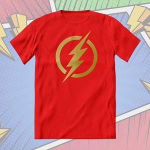 Playera de algodón en color rojo, estampada con el emblema de Flash en dorado metálico.