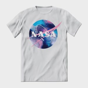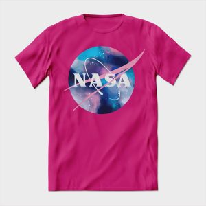 Playera de algodón en varios colores, estampada con el símbolo de la NASA y una galaxia de fondo