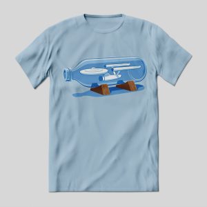 Playera de algodón en color azul cielo, estampada con la imagen de la nave Enterprise, de StarTrek (Viaje a las estrellas), como un modelo dentro de una botella de vidrio.