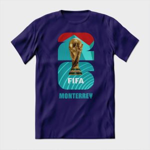 Playera de algodón en color morado, estampada con la imagen del mundial de fútbol de 2026, en Monterrey