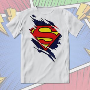 Playera de algodón en varios colores, estampada con el símbolo de Superman, debajo de la ilusión de tela desgarrada.