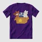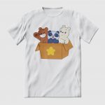 Playera de algodón en varios colores, estampada con la imagen de los Escandalositos, los bebés Pardo, Panda y Polar, en su caja mágica.