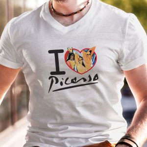 Playera para hombre de algodón en color blanco, estampada con la frase I ❤ Picasso, con un fragmento de su obra «Las señoritas de Avignon».